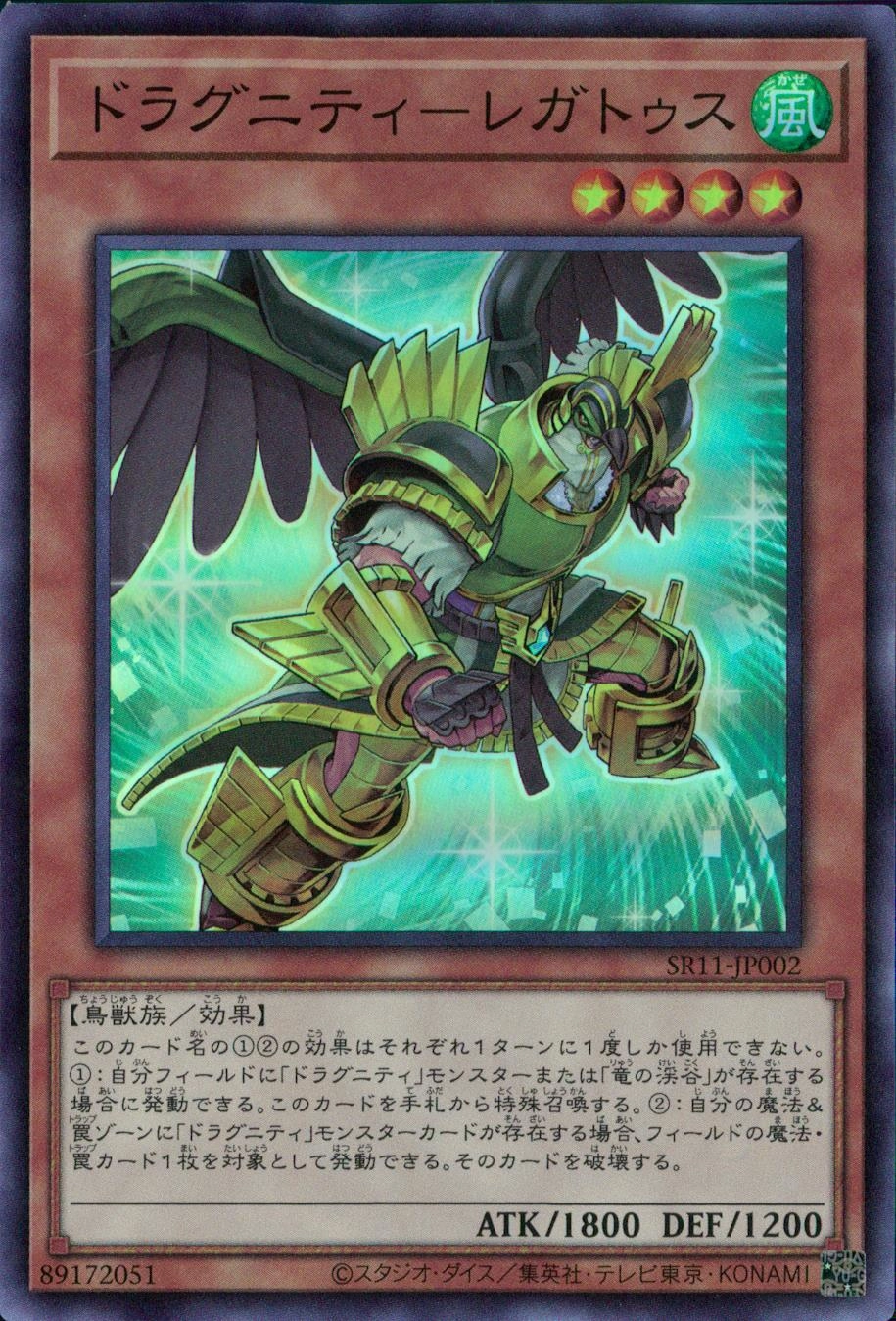 このカード名の12の効果はそれぞれ1ターンに1度しか使用できない。1:自分フィールドに「ドラグニティ」モンスターまたは「竜の渓谷」が存在する場合に発動できる。このカードを手札から特殊召喚する。2:自分の魔法&罠ゾーンに「ドラグニティ」モンスターカードが存在する場合、フィールドの魔法・罠カード1枚を対象として発動できる。そのカードを破壊する。