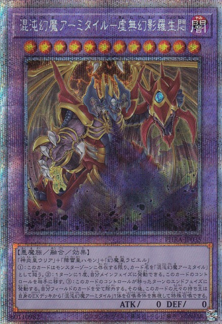 「神炎皇ウリア」+「降雷皇ハモン」+「幻魔皇ラビエル」1:このカードはモンスターゾーンに存在する限り、カード名を「混沌幻魔アーミタイル」として扱う。2:1ターンに1度、自分メインフェイズに発動できる。このカードのコントロールを相手に移す。3:このカードのコントロールが移ったターンのエンドフェイズに発動する。自分フィールドのカードを全て除外する。その後、このカードの元々の持ち主は自身のEXデッキから「混沌幻魔アーミタイル」1体を召喚条件を無視して特殊召喚できる。