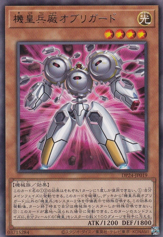 このカード名の12の効果はそれぞれ1ターンに1度しか使用できない。1:自分メインフェイズに発動できる。このカードを破壊し、デッキから「機皇兵廠オブリガード」以外の「機皇兵」モンスター2体を守備表示で特殊召喚する。この効果の発動後、ターン終了時まで自分は機械族モンスターしか特殊召喚できない。2:このカードが墓地へ送られた場合に発動できる。このターンのエンドフェイズに、自分フィールドの「機皇」モンスターの数×100ダメージを相手に与える。