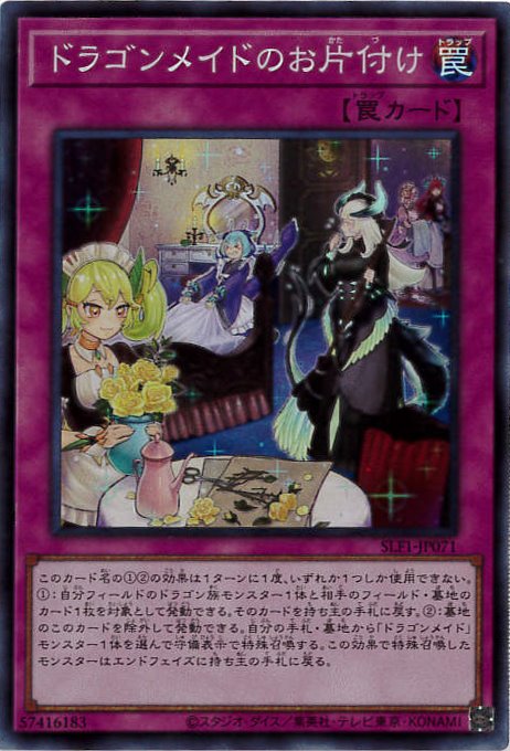 このカード名の12の効果は1ターンに1度、いずれか1つしか使用できない。1:自分フィールドのドラゴン族モンスター1体と相手のフィールド・墓地のカード1枚を対象として発動できる。そのカードを手札に戻す。2:墓地のこのカードを除外して発動できる。自分の手札・墓地から「ドラゴンメイド」モンスター1体を守備表示で特殊召喚する。この効果で特殊召喚したモンスターはエンドフェイズに手札に戻る。