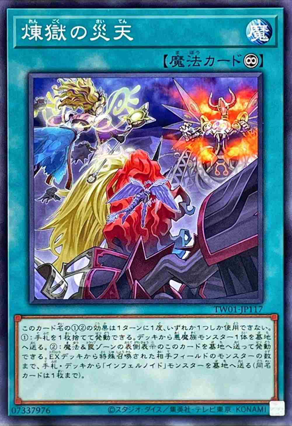 このカード名の12の効果は1ターンに1度、いずれか1つしか使用できない。1:手札を1枚捨てて発動できる。デッキから悪魔族モンスター1体を墓地へ送る。2:魔法&罠ゾーンの表側表示のこのカードを墓地へ送って発動できる。EXデッキから特殊召喚された相手フィールドのモンスターの数まで、手札・デッキから「インフェルノイド」モンスターを墓地へ送る(同名カードは1枚まで)。