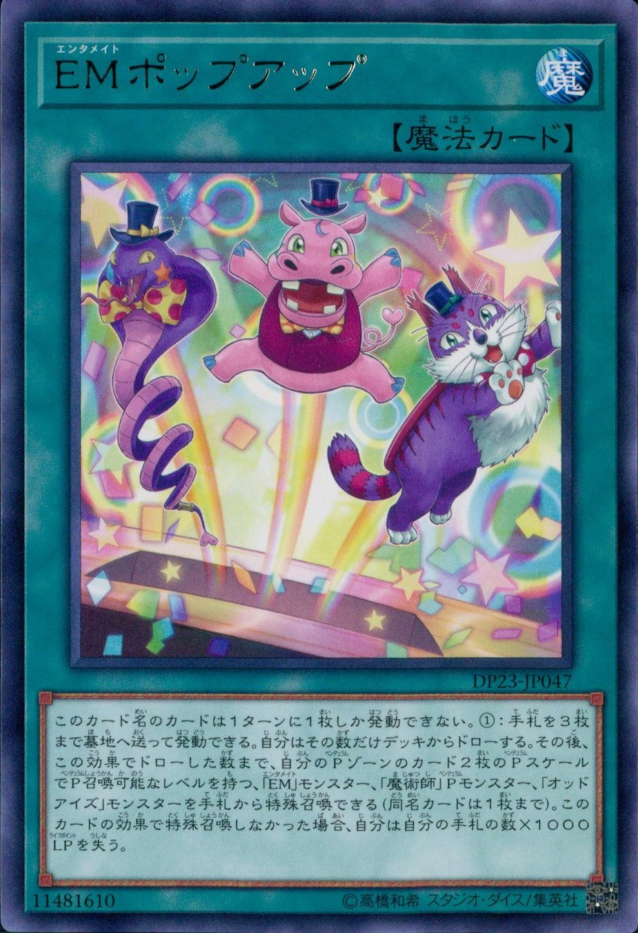 このカード名のカードは1ターンに1枚しか発動できない。1:手札を3枚まで墓地へ送って発動できる。自分はその数だけデッキからドローする。その後、この効果でドローした数まで、自分のPゾーンのカード2枚のPスケールでP召喚可能なレベルを持つ、「EM」モンスター、「魔術師」Pモンスター、「オッドアイズ」モンスターを手札から特殊召喚できる(同名カードは1枚まで)。このカードの効果で特殊召喚しなかった場合、自分は自分の手札の数×1000LPを失う。