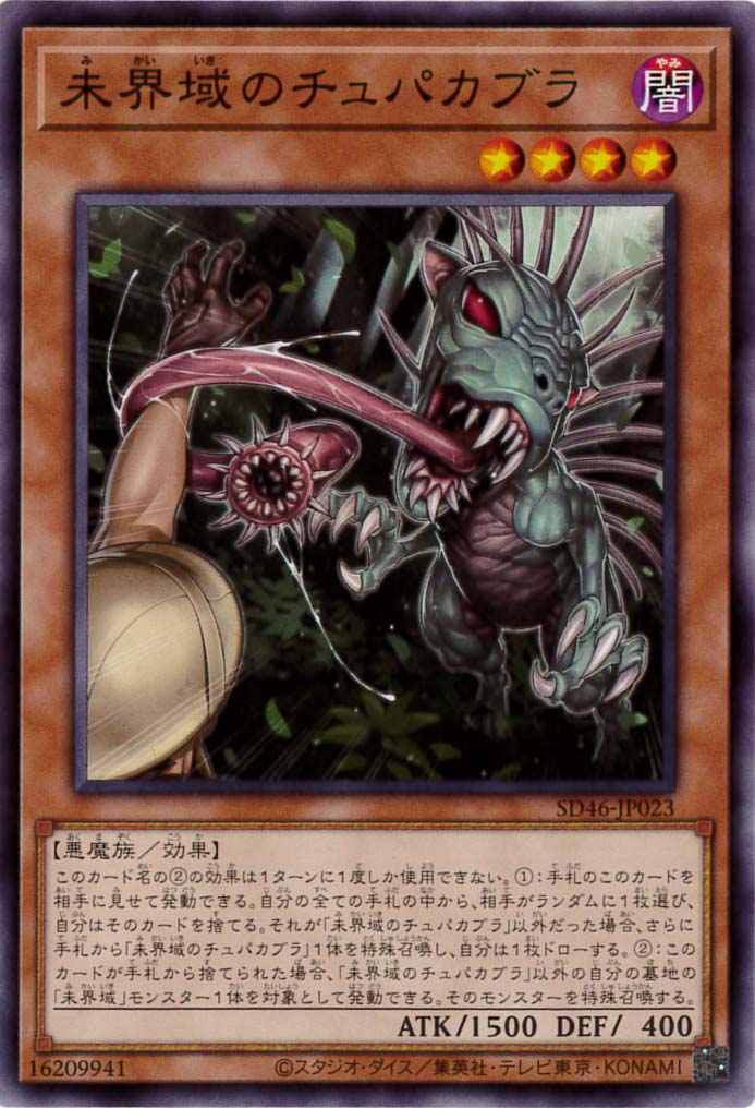 このカード名の2の効果は1ターンに1度しか使用できない。1:手札のこのカードを相手に見せて発動できる。自分の全ての手札の中から、相手がランダムに1枚選び、自分はそのカードを捨てる。それが「未界域のチュパカブラ」以外だった場合、さらに手札から「未界域のチュパカブラ」1体を特殊召喚し、自分は1枚ドローする。2:このカードが手札から捨てられた場合、「未界域のチュパカブラ」以外の自分の墓地の「未界域」モンスター1体を対象として発動できる。そのモンスターを特殊召喚する。