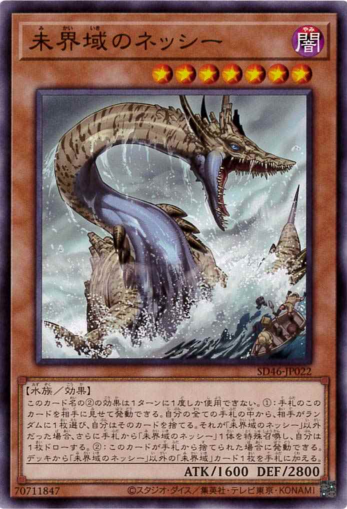 このカード名の2の効果は1ターンに1度しか使用できない。1:手札のこのカードを相手に見せて発動できる。自分の全ての手札の中から、相手がランダムに1枚選び、自分はそのカードを捨てる。それが「未界域のネッシー」以外だった場合、さらに手札から「未界域のネッシー」1体を特殊召喚し、自分は1枚ドローする。2:このカードが手札から捨てられた場合に発動できる。デッキから「未界域のネッシー」以外の「未界域」カード1枚を手札に加える。