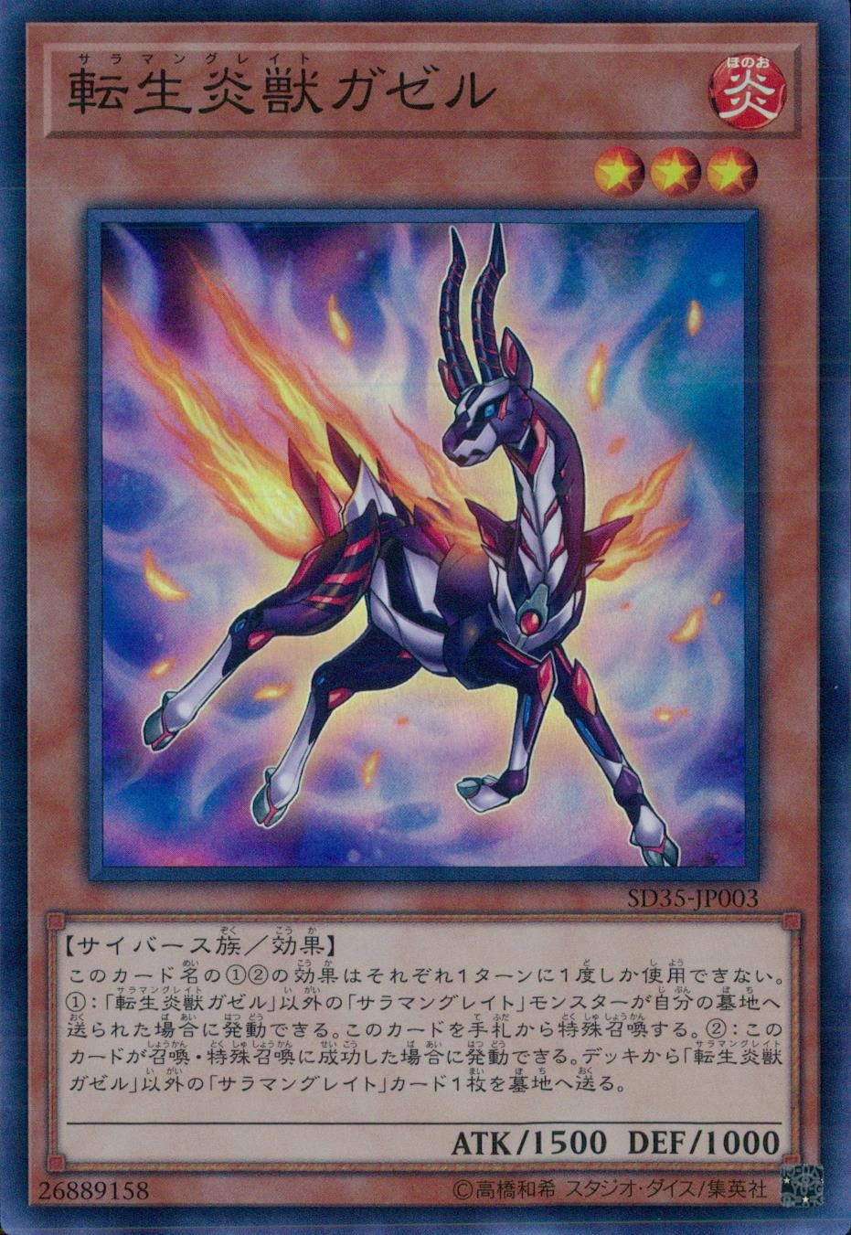 このカード名の12の効果はそれぞれ1ターンに1度しか使用できない。1:「転生炎獣ガゼル」以外の「サラマングレイト」モンスターが自分の墓地へ送られた場合に発動できる。このカードを手札から特殊召喚する。2:このカードが召喚・特殊召喚した場合に発動できる。デッキから「転生炎獣ガゼル」以外の「サラマングレイト」カード1枚を墓地へ送る。