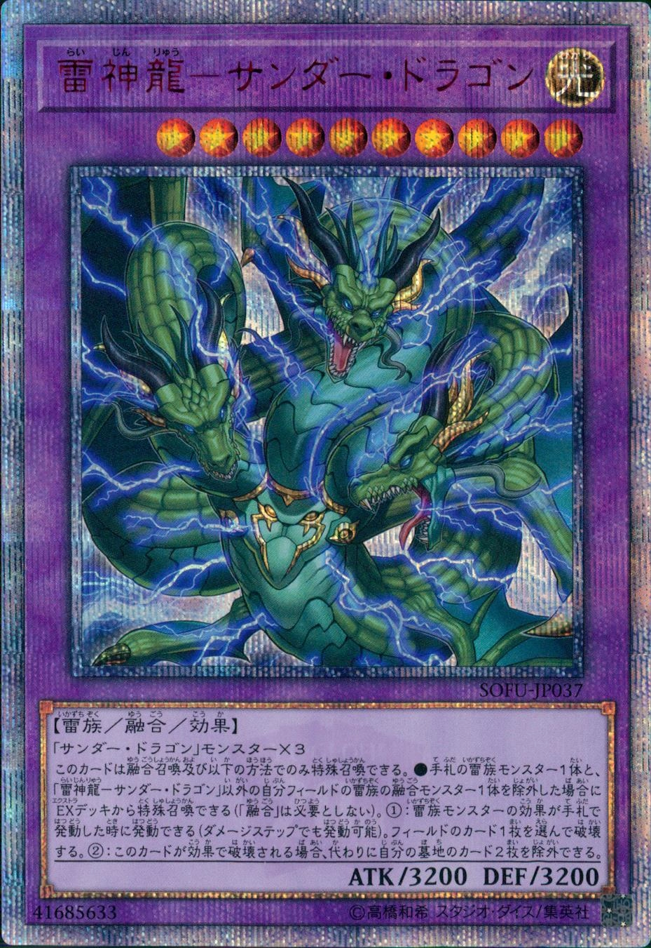 「サンダー・ドラゴン」モンスター×3このカードは融合召喚及び以下の方法でのみ特殊召喚できる。●手札の雷族モンスター1体と、「雷神龍-サンダー・ドラゴン」以外の自分フィールドの雷族の融合モンスター1体を除外した場合にEXデッキから特殊召喚できる。1:雷族モンスターの効果が手札で発動した時に発動できる(ダメージステップでも発動可能)。フィールドのカード1枚を破壊する。2:フィールドのこのカードが効果で破壊される場合、代わりに自分の墓地のカード2枚を除外できる。