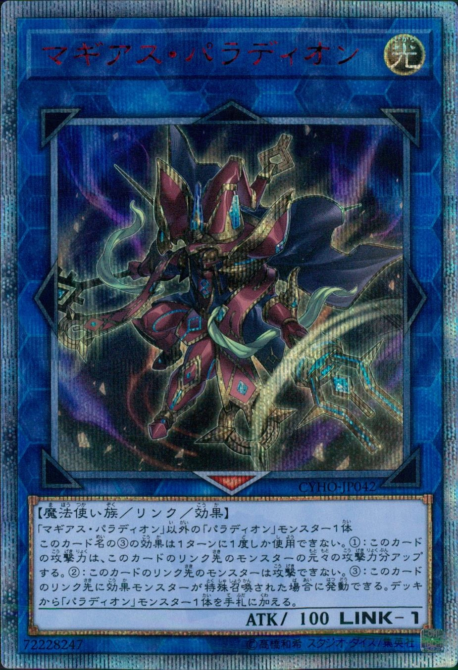 「マギアス・パラディオン」以外の「パラディオン」モンスター1体このカード名の3の効果は1ターンに1度しか使用できない。1:このカードの攻撃力は、このカードのリンク先のモンスターの元々の攻撃力分アップする。2:このカードのリンク先のモンスターは攻撃できない。3:このカードのリンク先に効果モンスターが特殊召喚された場合に発動できる。デッキから「パラディオン」モンスター1体を手札に加える。