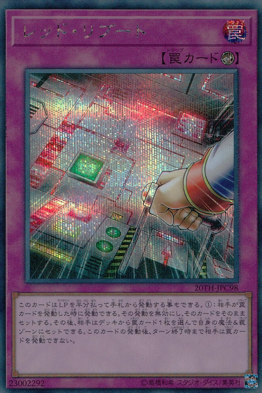 このカードはLPを半分払って手札から発動する事もできる。1:相手が罠カードを発動した時に発動できる。その発動を無効にし、そのカードをそのままセットする。その後、相手はデッキから罠カード1枚を自身の魔法&罠ゾーンにセットできる。このカードの発動後、ターン終了時まで相手は罠カードを発動できない。
