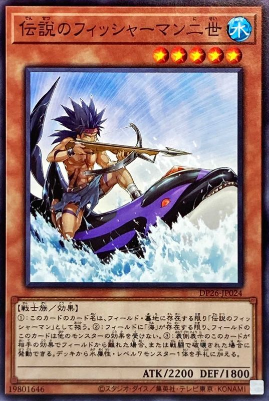 1:このカードのカード名は、フィールド・墓地に存在する限り「伝説のフィッシャーマン」として扱う。2:フィールドに「海」が存在する限り、フィールドのこのカードは他のモンスターの効果を受けない。3:表側表示のこのカードが相手の効果でフィールドから離れた場合、または戦闘で破壊された場合に発動できる。デッキから水属性・レベル7モンスター1体を手札に加える。
