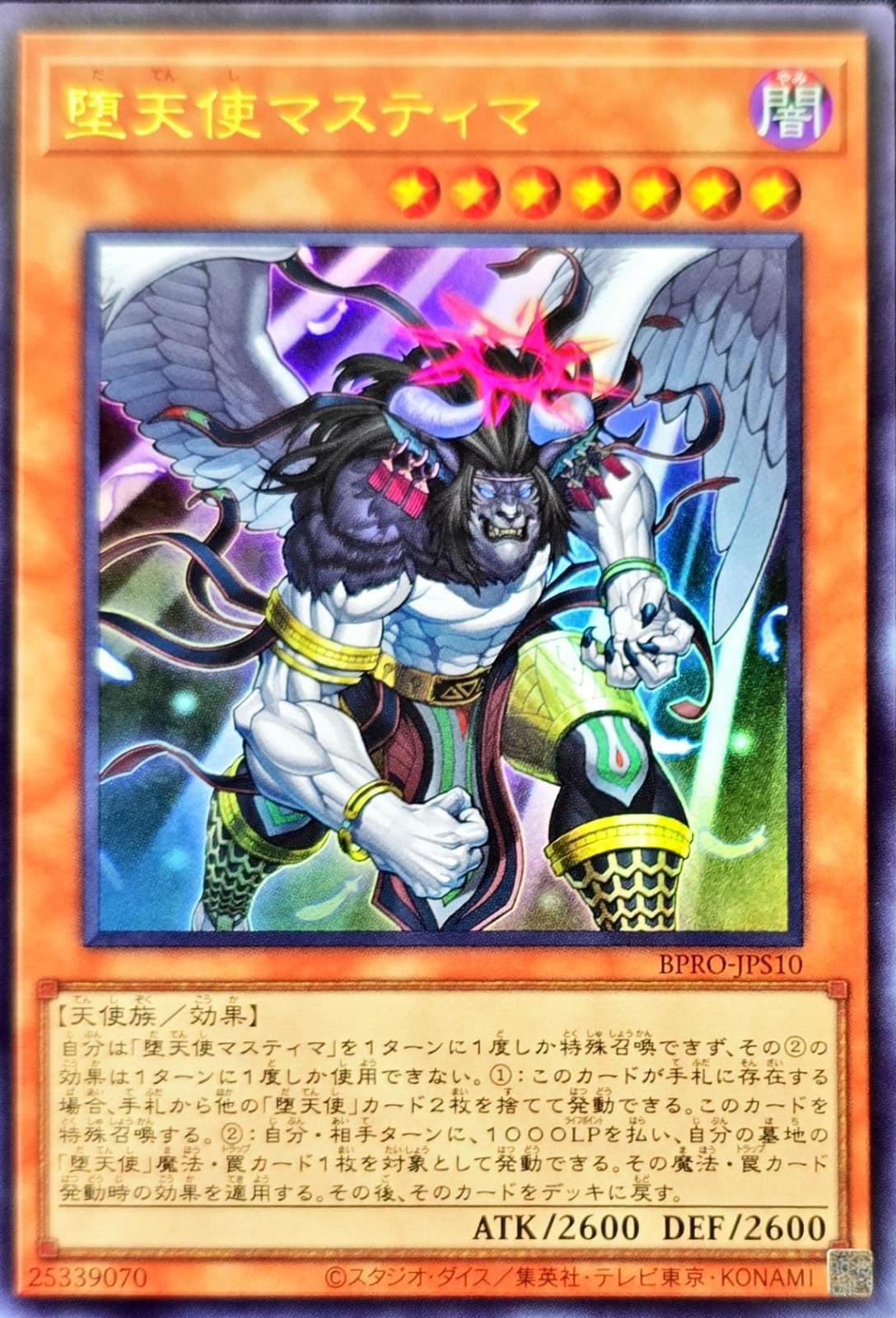 自分は「堕天使マスティマ」を1ターンに1度しか特殊召喚できず、その2の効果は1ターンに1度しか使用できない。1:このカードが手札に存在する場合、手札から他の「堕天使」カード2枚を捨てて発動できる。このカードを特殊召喚する。2:自分・相手ターンに、1000LPを払い、自分の墓地の「堕天使」魔法・罠カード1枚を対象として発動できる。その魔法・罠カード発動時の効果を適用する。その後、そのカードをデッキに戻す。