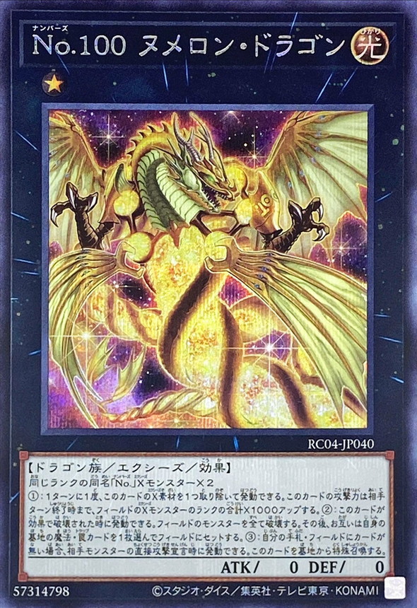 同じランクの同名「No.」Xモンスター×21:1ターンに1度、このカードのX素材を1つ取り除いて発動できる。このカードの攻撃力は相手ターン終了時まで、フィールドのXモンスターのランクの合計×1000アップする。2:このカードが効果で破壊された時に発動できる。フィールドのモンスターを全て破壊する。その後、お互いは自身の墓地の魔法・罠カードを1枚選んでフィールドにセットする。3:自分の手札・フィールドにカードが無い場合、相手モンスターの直接攻撃宣言時に発動できる。このカードを墓地から特殊召喚する。