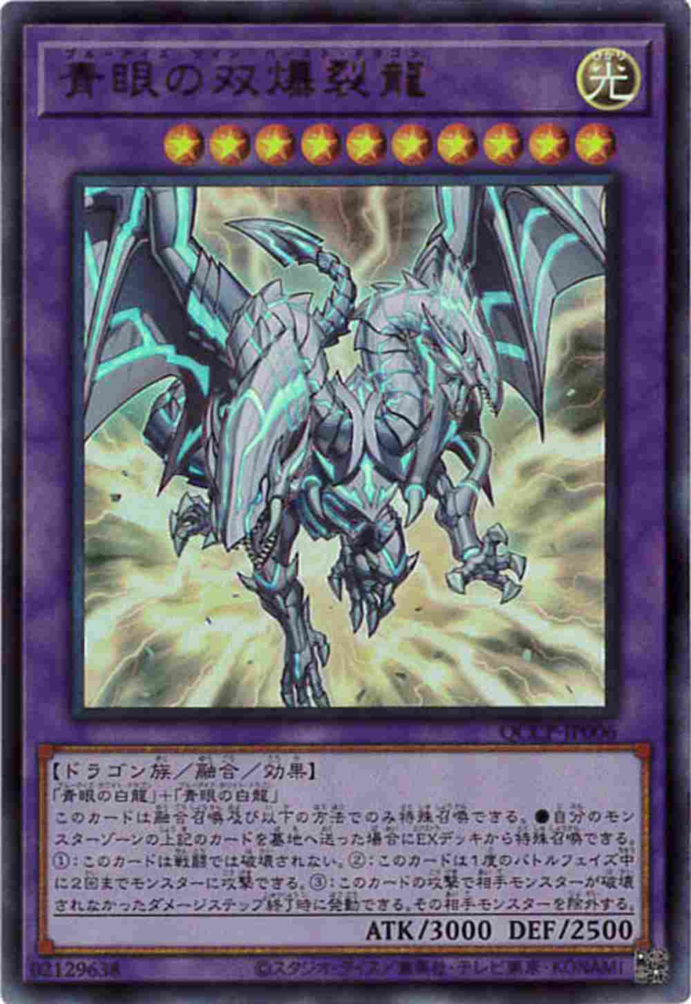 「青眼の白龍」+「青眼の白龍」このカードは融合召喚及び以下の方法でのみ特殊召喚できる。●自分のモンスターゾーンの上記のカードを墓地へ送った場合にEXデッキから特殊召喚できる。1:このカードは戦闘では破壊されない。2:このカードは1度のバトルフェイズ中に2回までモンスターに攻撃できる。3:このカードの攻撃で相手モンスターが破壊されなかったダメージステップ終了時に発動できる。その相手モンスターを除外する。