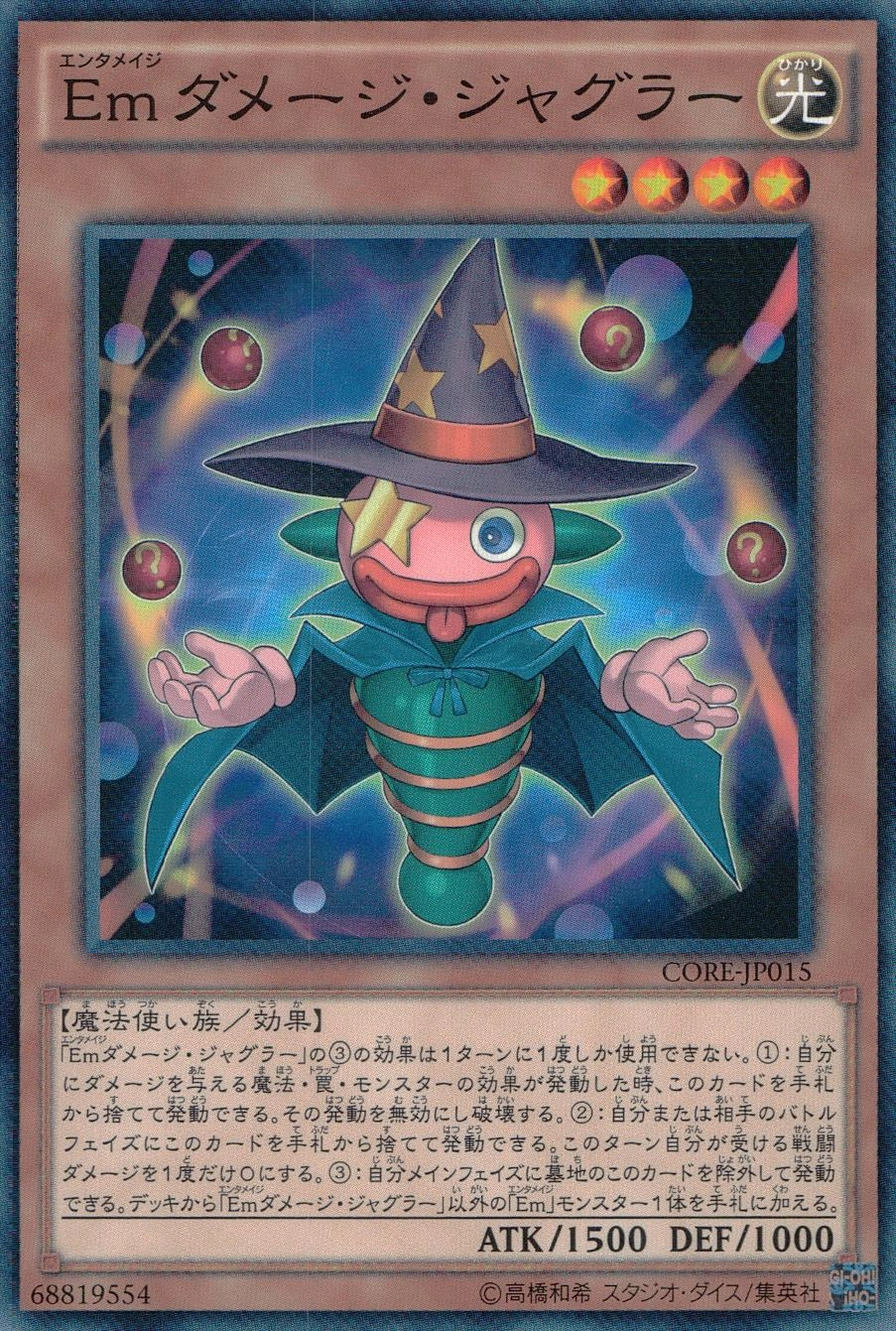 このカード名の3の効果は1ターンに1度しか使用できない。1:自分にダメージを与える魔法・罠・モンスターの効果が発動した時、このカードを手札から捨てて発動できる。その発動を無効にし破壊する。2:自分・相手のバトルフェイズに、このカードを手札から捨てて発動できる。このターン、自分が受ける戦闘ダメージは1度だけ0になる。3:墓地のこのカードを除外して発動できる。デッキから「Emダメージ・ジャグラー」以外の「Em」モンスター1体を手札に加える。