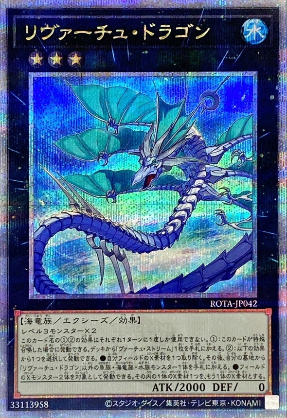 レベル3モンスター×2このカード名の12の効果はそれぞれ1ターンに1度しか使用できない。1:このカードが特殊召喚した場合に発動できる。デッキから「ヴァーチュ・ストリーム」1枚を手札に加える。2:以下の効果から1つを選択して発動できる。●自分フィールドのX素材を1つ取り除く。その後、自分の墓地から「リヴァーチュ・ドラゴン」以外の魚族・海竜族・水族モンスター1体を手札に加える。●フィールドのXモンスター2体を対象として発動できる。その内の1体のX素材1つを、もう1体のX素材とする。