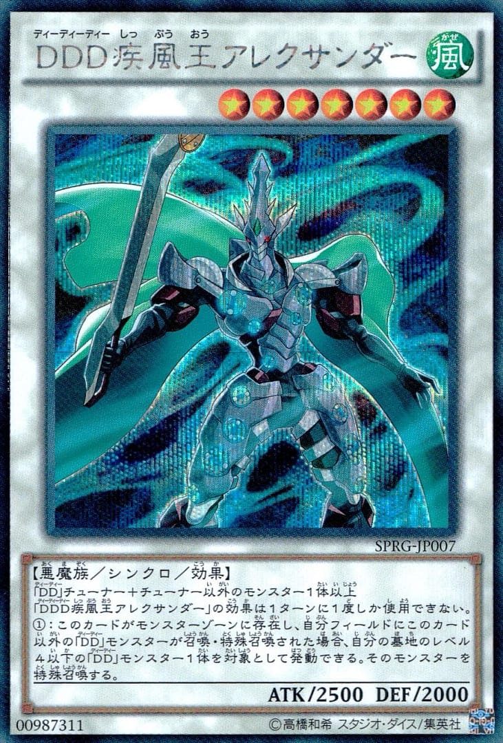 「DD」チューナー+チューナー以外のモンスター1体以上「DDD疾風王アレクサンダー」の効果は1ターンに1度しか使用できない。1:このカードがモンスターゾーンに存在し、自分フィールドにこのカード以外の「DD」モンスターが召喚・特殊召喚された場合、自分の墓地のレベル4以下の「DD」モンスター1体を対象として発動できる。そのモンスターを特殊召喚する。