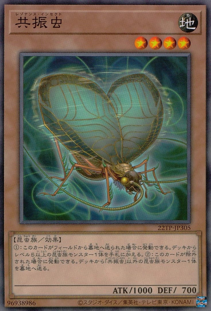 1:このカードがフィールドから墓地へ送られた場合に発動できる。デッキからレベル5以上の昆虫族モンスター1体を手札に加える。2:このカードが除外された場合に発動できる。デッキから「共振虫」以外の昆虫族モンスター1体を墓地へ送る。