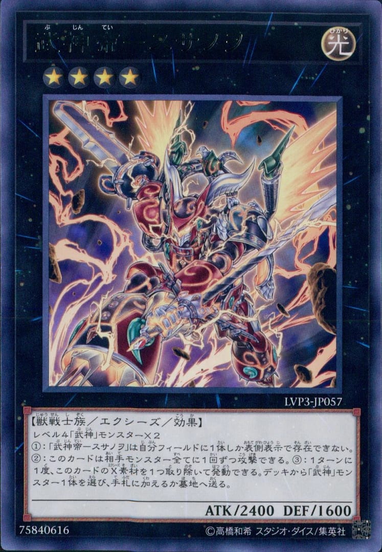 レベル4「武神」モンスター×21:「武神帝-スサノヲ」は自分フィールドに1体しか表側表示で存在できない。2:このカードは相手モンスター全てに1回ずつ攻撃できる。3:1ターンに1度、このカードのX素材を1つ取り除いて発動できる。デッキから「武神」モンスター1体を選び、手札に加えるか墓地へ送る。
