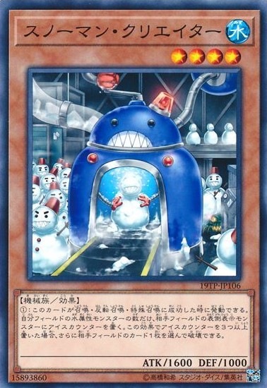 1:このカードが召喚・反転召喚・特殊召喚に成功した時に発動できる。自分フィールドの水属性モンスターの数だけ、相手フィールドの表側表示モンスターにアイスカウンターを置く。この効果でアイスカウンターを3つ以上置いた場合、さらに相手フィールドのカード1枚を選んで破壊できる。