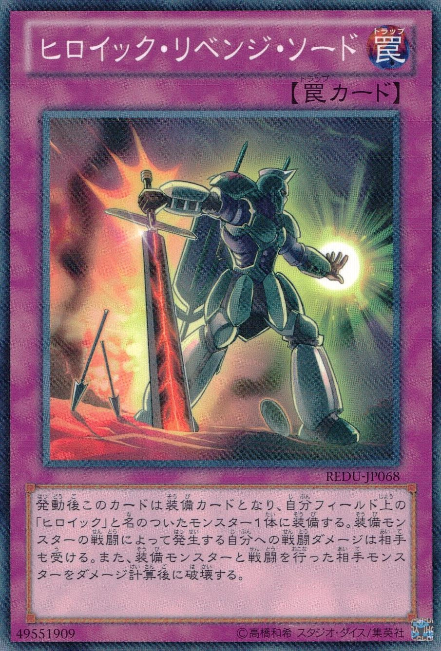 発動後このカードは装備カードとなり、自分フィールド上の「ヒロイック」と名のついたモンスター1体に装備する。装備モンスターの戦闘によって発生する自分への戦闘ダメージは相手も受ける。また、装備モンスターと戦闘を行った相手モンスターをダメージ計算後に破壊する。