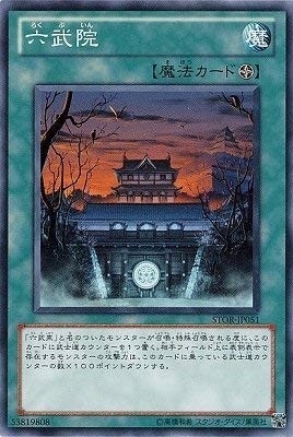 「六武衆」と名のついたモンスターが召喚・特殊召喚される度に、このカードに武士道カウンターを1つ置く。相手フィールド上に表側表示で存在するモンスターの攻撃力は、このカードに乗っている武士道カウンターの数×100ポイントダウンする。