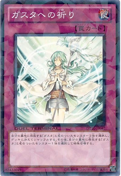 自分の墓地の「ガスタ」と名のついたモンスター2体を選択し、その2体をデッキに加えてシャッフルする。その後、自分の墓地の「ガスタ」と名のついたモンスター1体を選択して特殊召喚する。
