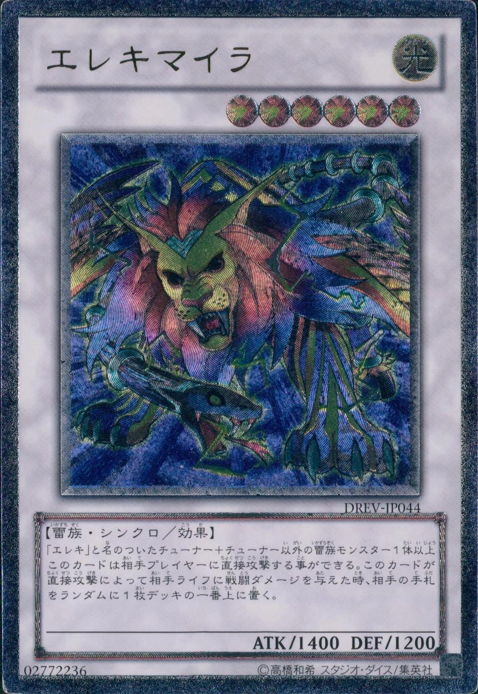 「エレキ」と名のついたチューナー+チューナー以外の雷族モンスター1体以上このカードは相手プレイヤーに直接攻撃する事ができる。このカードが直接攻撃によって相手ライフに戦闘ダメージを与えた時、相手の手札をランダムに1枚デッキの一番上に置く。