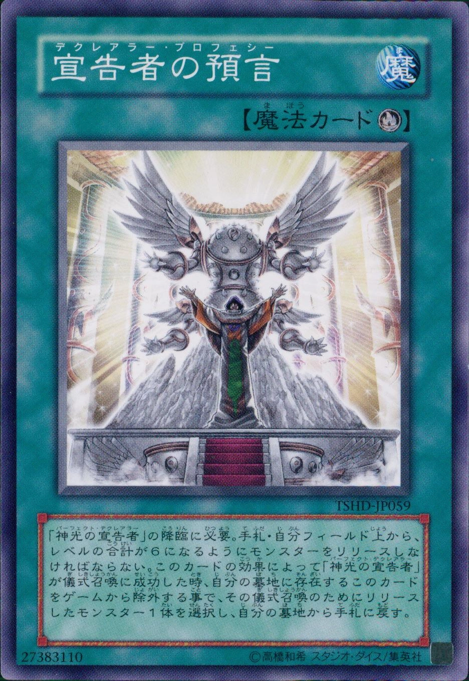 「神光の宣告者」の降臨に必要。自分の手札・フィールド上から、レベルの合計が6になるようにモンスターをリリースしなければならない。このカードの効果によって「神光の宣告者」が儀式召喚に成功した時、自分の墓地のこのカードをゲームから除外する事で、その儀式召喚のためにリリースしたモンスター1体を選択し、自分の墓地から手札に戻す。