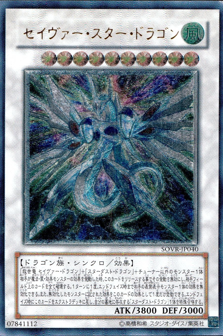 「救世竜 セイヴァー・ドラゴン」+「スターダスト・ドラゴン」+チューナー以外のモンスター1体相手が魔法・罠・効果モンスターの効果を発動した時、このカードをリリースする事でその発動を無効にし、相手フィールド上のカードを全て破壊する。1ターンに1度、相手フィールド上に表側表示で存在するモンスター1体を選択し、その効果をエンドフェイズ時まで無効にできる。また、この効果で無効にしたモンスターに記された効果を、このターンこのカードの効果として1度だけ発動できる。エンドフェイズ時、このカードをエクストラデッキに戻し、自分の墓地の「スターダスト・ドラゴン」1体を選択して特殊召喚する。