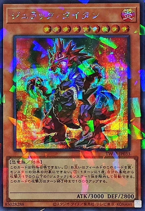 このカードは特殊召喚できない。1:お互いはフィールドのこのカードを罠・モンスターの効果の対象にできない。2:1ターンに1度、自分の墓地から攻撃力1700以下の「ジュラック」モンスター1体を除外して発動できる。このカードの攻撃力はターン終了時まで1000アップする。