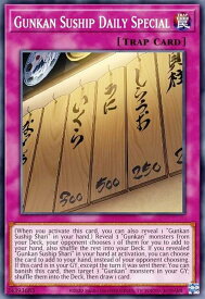 SPELL Field Once per turn, if you Normal or Special Summon a "Gunkan" monster(s), even during the Damage Step: You can place 1 "Gunkan" card from your Deck on top of your Deck. Once per turn, if a face-up "Gunkan" monster(s) you control that was Special Summoned from the Extra Deck is sent to your GY by an opponent's card: Activate this effect; your opponent pays LP exactly equal to that monster's DEF in the GY, then you can apply this effect.●Special Summon 1 "Gunkan Suship Shari" from your hand, then Special Summon 1 "Gunkan" Xyz Monster from your Extra Deck, by using that card you control as material. (This is treated as an Xyz Summon.)